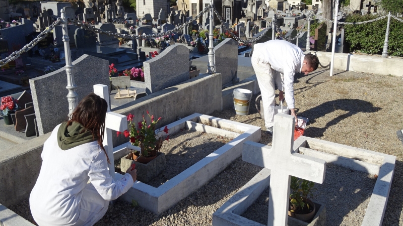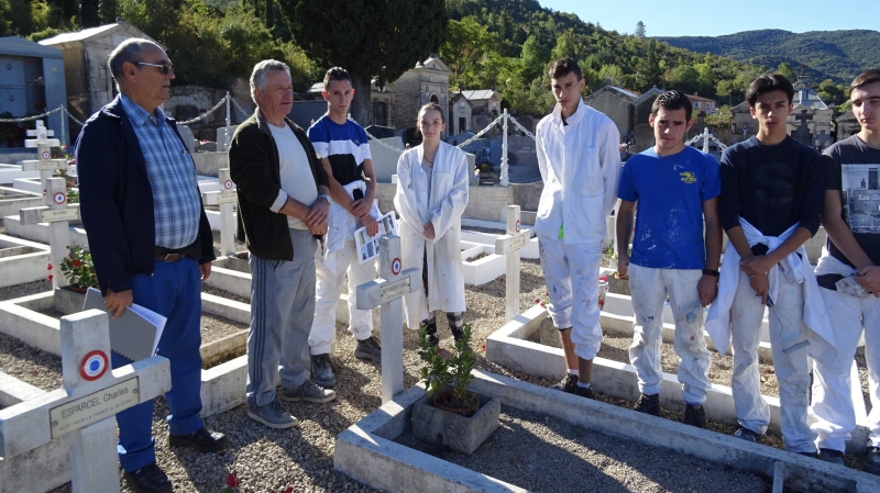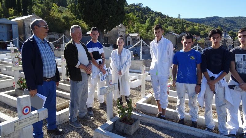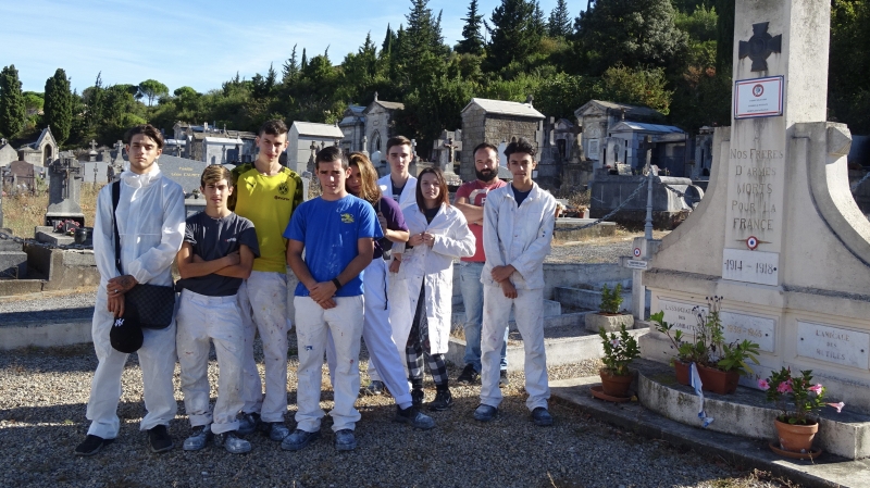 A l’occasion du centenaire de la fin de la première guerre mondiale, le Souvenir Français en liaison en partenariat avec la commune de Bédarieux, a initié la rénovation des tombes et du monument aux morts de ce Carré Militaire. Situé au cimetière de Bédarieux le Carré Militaire est le lieu où sont inhumés les enfants de la commune morts pour la France durant les différentes guerres du siècle dernier. Les élèves de la section peinture en bâtiment du Lycée Fernand Léger en association avec les élèves de l’IME La Salette ont nettoyé et remis en peinture toutes les tombes, la clôture périphérique et le monument aux Morts de ce Carré Militaire.