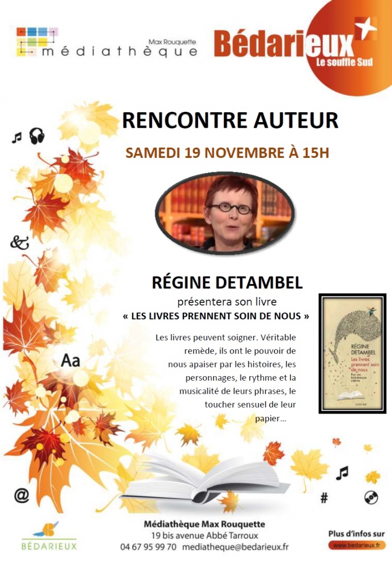 L'auteure Régine Detambel présentera son livre «Les livres prennent soin de nous» samedi 19 novembre à 15h à la Médiathèque Max Rouquette.
