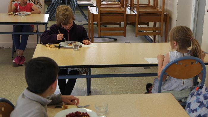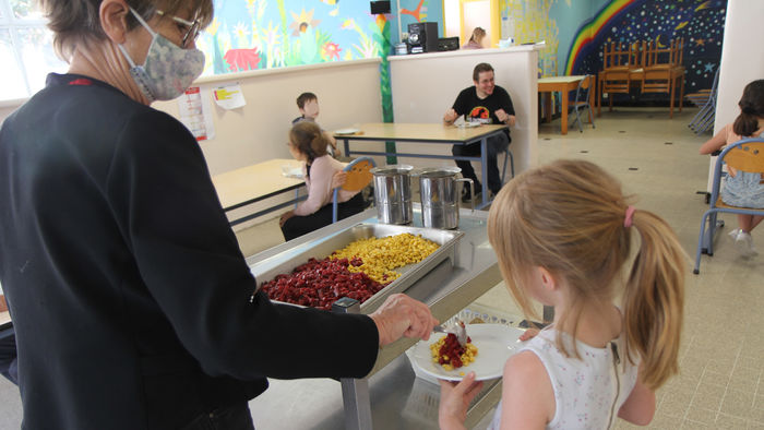 Cette première semaine, une vingtaine d’enfants sont inscrits au restaurant scolaire chaque jour. Les enfants s’installent dans la cantine par petits groupes pour éviter tout contact. Deux par table, c’est la règle, avec une distance d’au moins un mètre entre les enfants. Un animateur s’occupe de les servir pour éviter qu’ils ne touchent les cuillères ou les carafes. Ce nombre réduit permet aux enfants de manger plus au calme et de discuter plus tranquillement avec leur voisin de table. Bénédicta, 7 ans, nous explique « C’est bizarre comme situation, mais j’aime les maîtresses, les animateurs, les classes et le travail. Donc je suis contente de revenir à l’école. »
