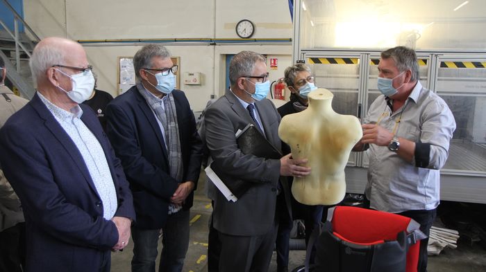 Après une présentation détaillée de l’entreprise et de ses activités, Richard et Edouard Juszkiewicz, les dirigeants ont présenté différents produits innovants, fleurons de cette entreprise en plein développement : les blocs de mousse dure pour le fraisage de corset sièges, le coussin de positionnement Profil Care, les châssis roulants : verticalisateurs, déambulateurs et supports sièges, le coussin à prévention escarres Profil Air, un savoir-faire encadré par une multitude de brevets internationaux., L’occasion pour les représentants de l’État de se rendre compte du niveau exceptionnel de maîtrise des process et de la qualité des produits.
