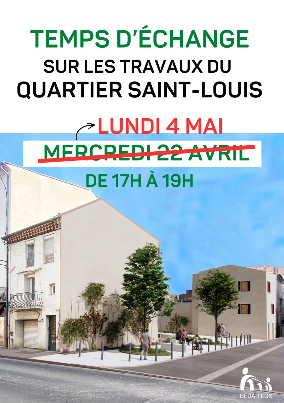 Dans le cadre de la poursuite du projet de requalification du quartier Saint-Louis, les riverains et commerçants du quartier Saint-Louis sont invités à un temps d’échange libre et informel le mercredi 22 avril de 17h à 19h lundi 4 mai de 17h à 19h sur la place du quartier.
