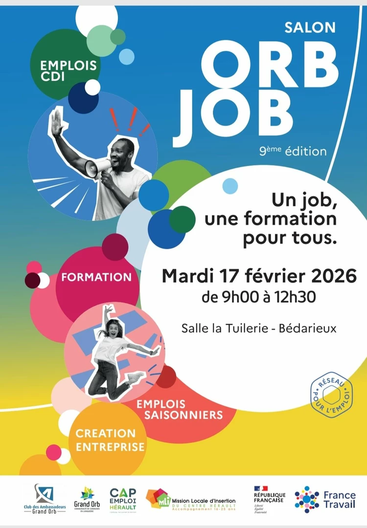 C’est LE rendez-vous du recrutement en Grand Orb ! Proposé par la Communauté de communes Grand Orb, le Club des Ambassadeurs de Grand Orb et France Travail, le forum Orb Job revient pour sa 9ème édition mardi 17 février 2026 de 9h à 12h30 à La Tuilerie à Bédarieux.