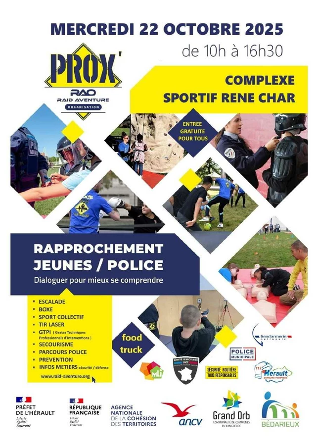 L'association Raid Aventure propose une journée sportive et citoyenne unique le Mercredi 22 octobre 2025 de 10h à 16h30, au complexe sportif René Char. Cette action, dans le cadre du dispositif « Prox », permet aux jeunes et aux habitants de découvrir les métiers de la sécurité et de renforcer le lien avec les acteurs locaux.