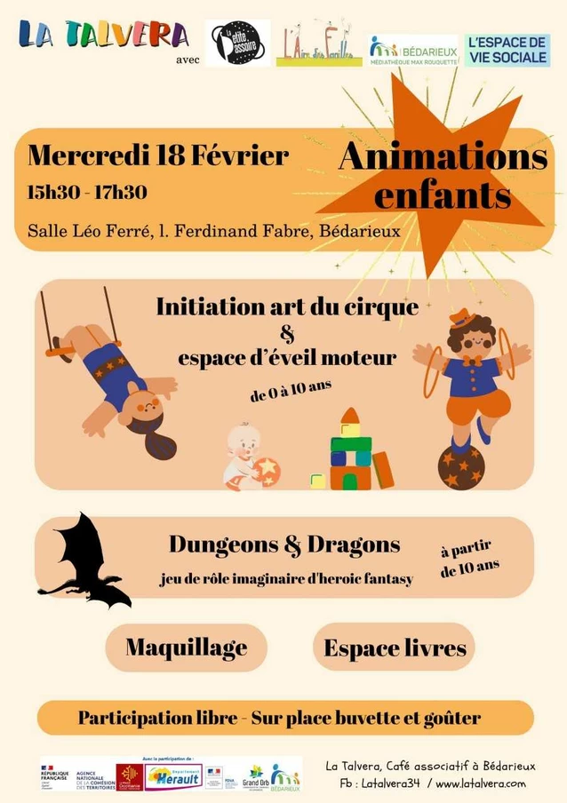 La Talvera vous invite à une après-midi d'animations pour enfants le mercredi 18 février 2026 à 15h30 à la salle Léo Ferré. Au programme, initiation aux arts du cirque, Dungeons et dragons, espace d'éveil moteur, maquillage et plein d'autres animations !