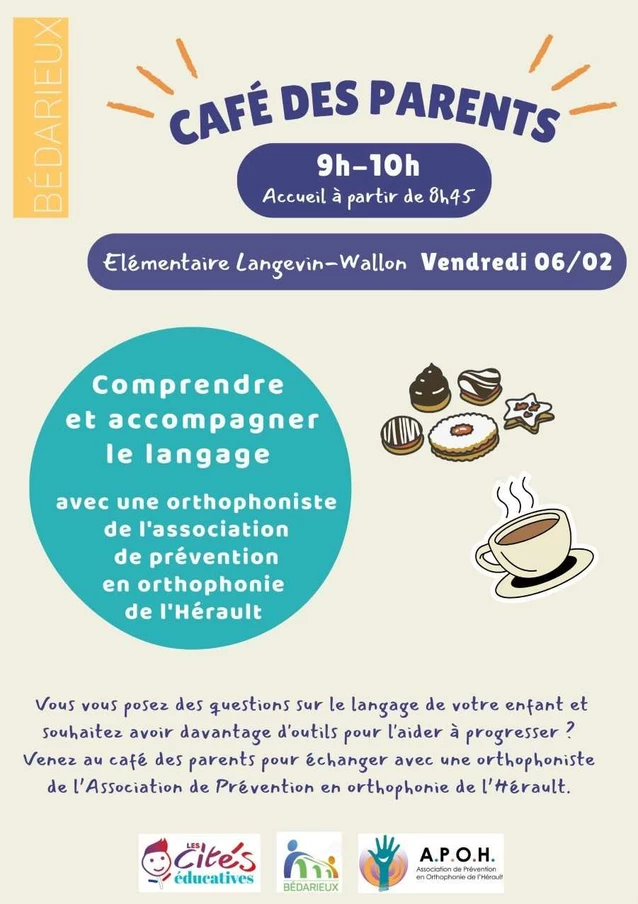 La cité éductaive organise le café des parents le vendredi 6 février 2026 de 9h à 10h à l'école élémentaire Langevin-Wallon. Plusieurs recontres sont prévues afin d'échanger sur divers sujets tels que la compréhension et l'accompagnement du langage avec une othophoniste de l'association de prévntion en orthophonie de l'Hérault.