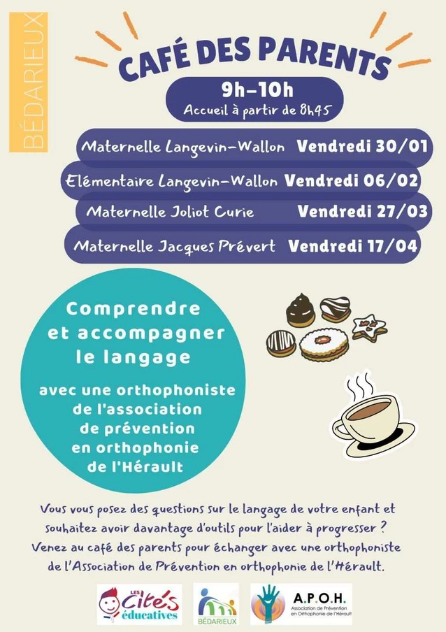 La cité éductaive organise le café des parents le vendredi 17 avril 2026 de 9h à 10h à l'école maternelle Jacques Prévert. Plusieurs recontres sont prévues afin d'échanger sur divers sujets tels que la compréhension et l'accompagnement du langage avec une othophoniste de l'association de prévntion en orthophonie de l'Hérault.