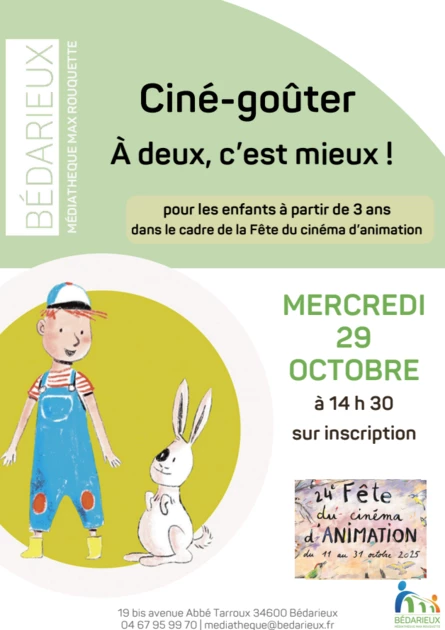oDans le cadre de la Fête du cinéma d'animation, la médiathèque Max Rouquette vous invite à un ciné-goûter le mercredi 29 octobre 2025 à 14h30 . Un programme de sept courts métrages sur le thème de l'amitié, spécialement conçu pour les plus jeunes spectateurs.