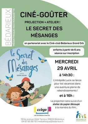 Un ciné-goûter exceptionnel s'annonce ce mercredi 29 avril à 14h30 à la médiathèque de Bédarieux, avec la projection du film " Le secret des mésanges" , qui sera suivi d'un atelier d'animation en papier découpé, à la manière du film : au programme, dessin, coloriage, découpage, assemblage, animation et photographie. Les parents pourront ensuite récupérer la petite vidéo issue de ce travail d'équipe.