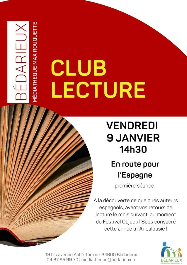 Abonnez-vous à la newsletter !La médiathèque Max Rouquette vous invite à sa première séance club lecture le vendredi 9 janvier 2026 à 14h30. Une invitation à découvrir des auteurs espagnols en parallèle du festival Objectif Suds sur le thème de l'Andalousie.