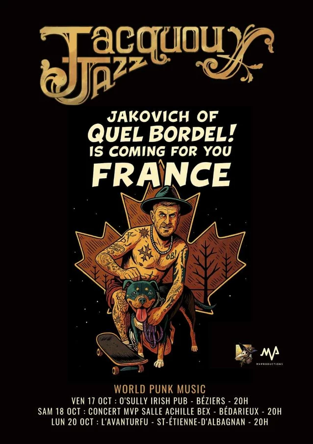 L'association MVProductions et le Festival Au coin de la vigne vous proposent un concert de Jacquou Jazz le samedi 18 octobre 2025 à partir de 19h30 à la salle Achille Bex. Une rencontre explosive entre Jakovich de "QUEL BORDEL" et Fabien de "BandàpArt", dans une ambiance festive et conviviale.