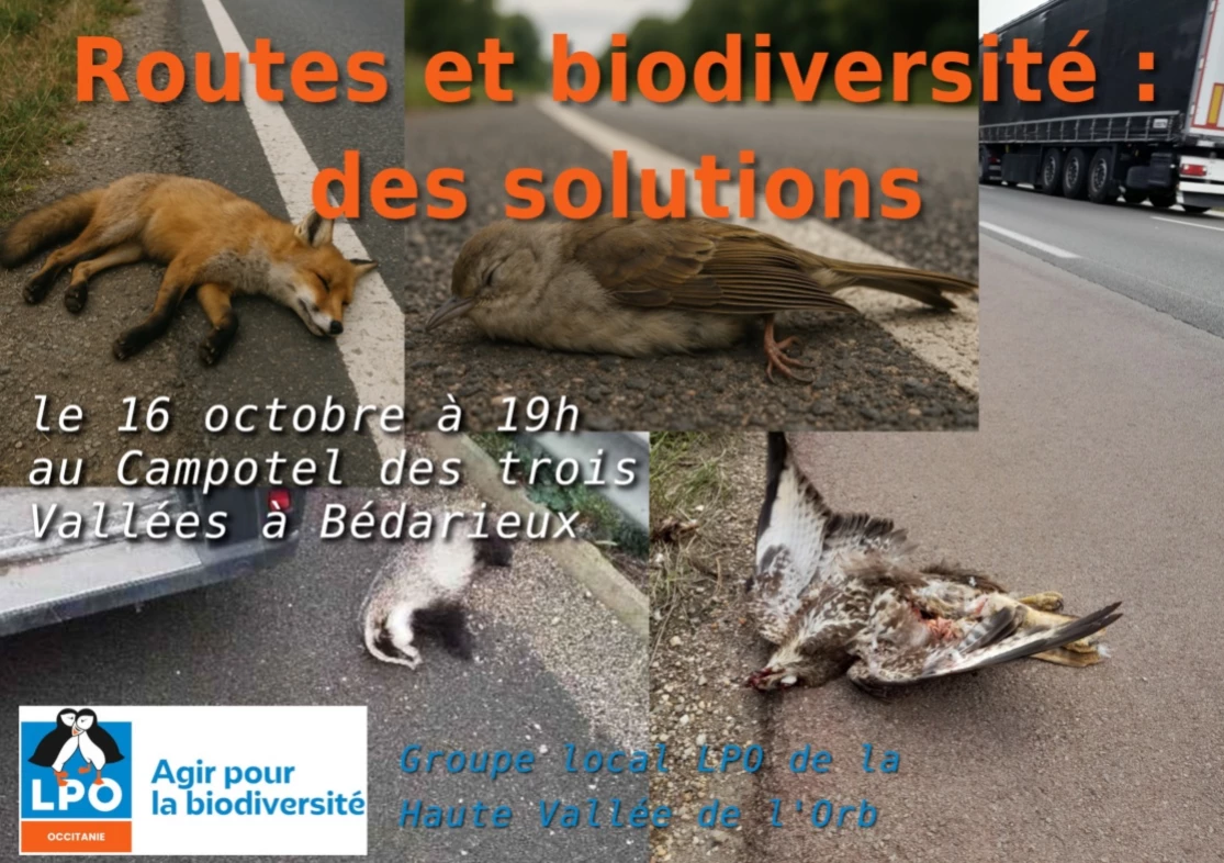 La LPO vous propose une conférence "Route grandeur nature" le jeudi 16 octobre 2025 à 19h au Campotel les Trois Vallées. L'occasion d'échanger avec Cyril Assenat, chargé d'Opération Biodiversité sur les routes départementales de l'Hérault, sur les problèmes et solutions concernant la mortalité de la faune sauvage à cause du réseau routier.