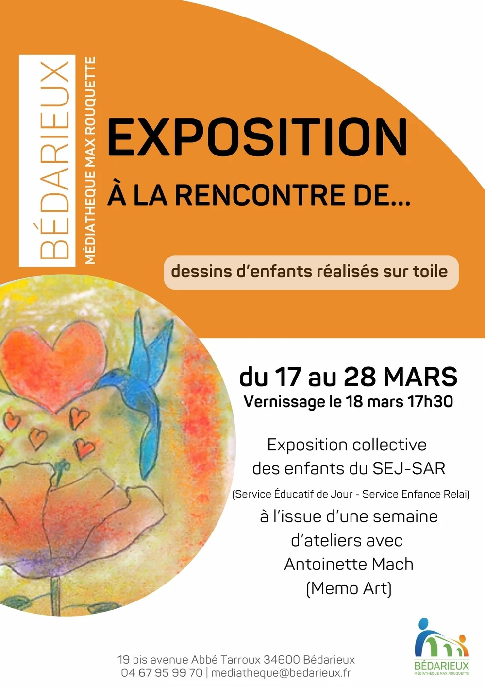 Du 17 au 28 mars 2026 , la médiathèque Max Rouquette accueille une exposition de dessins d'enfants du Service Éducatif de Jour - Service Enfance Relai (SEJ-SAR). Cette exposition est proposée à l'issue d'une semaine d'ateliers organisées avec Antoinette Mach de l'association Memo Art.