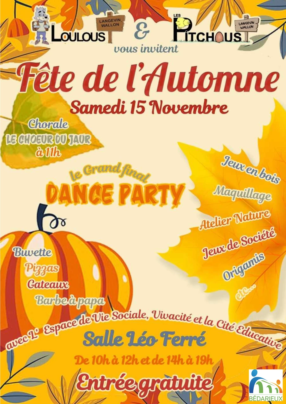 L' association des parents d'élèves de la maternelle Langevin-Wallon, avec l'Espace de Vie Sociale, Vivavité, et la Cité éducative vous invitent à une fête de l'automne le samedi 15 novembre 2025 de 10h à 12h et de 14h à 19h à la salle Léo Férré. Au programme, jeux en bois, origamis, jeux de société, maquillage, dance party et bien d'autres surprises dans la convivialité.