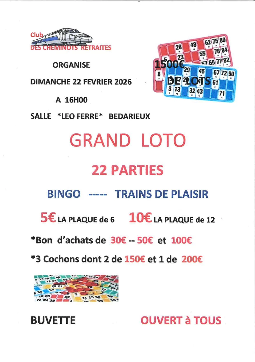 Le club des cheminots retraités organise un grand loto (22 parties) le dimanche 22 février 2026 à 16h à la salle Léo Ferré. A retrouver sur place : une buvette, et de nombreux lots à gagner ! Le tout dans une ambiance conviviale et festive.