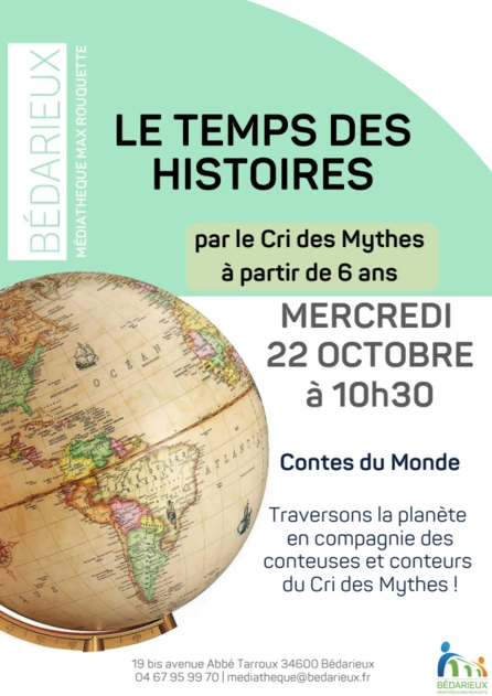 Abonnez-vous à la newsletter !La médiathèque Max Rouquette vous invite à découvrir le Temps des Histoires par le Crid des Mythes, le mercredi 22 octobre 2025 à 10h30. Une invitation à traverser la planète en compagnie des conteuses et conteurs.