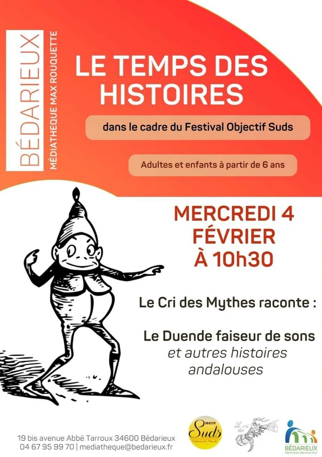 La médiathèque Max Rouquette vous invite à nouveau rendez-vous du Temps des Histoires le mercredi 4 février 2026 à 10h30 . Dans le cadre du festival Objectif Suds, le Cri des Mythes raconte : "Le Duende faiseur de sons" et autres histoires andalouses.