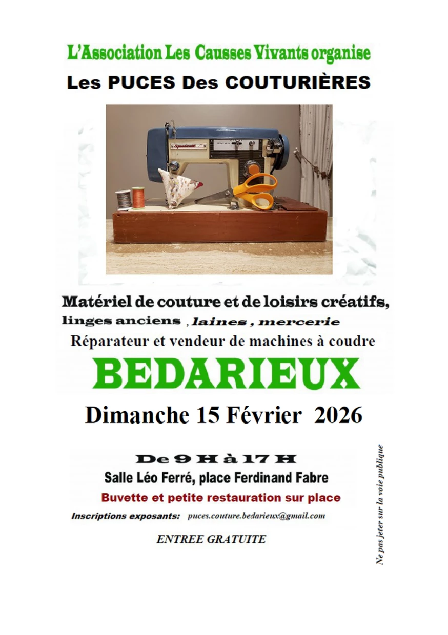 L'association Les Causses Vivants organise les puces des couturières le dimanche 15 février 2026 de 9h à 17h à la salle Léo Ferré. Sur place il sera proposé du matériel de couture et de loisirs créatifs, ou encore de la mercerie et de la laine. Il sera également possible d'acheter ou de faire réparer sa machine à coudre.