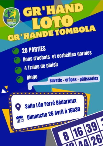 Grand Orb Bédarieux Handball organise un loto le dimanche 26 avril 2026 à 16h30 , à la salle Léo Ferré.