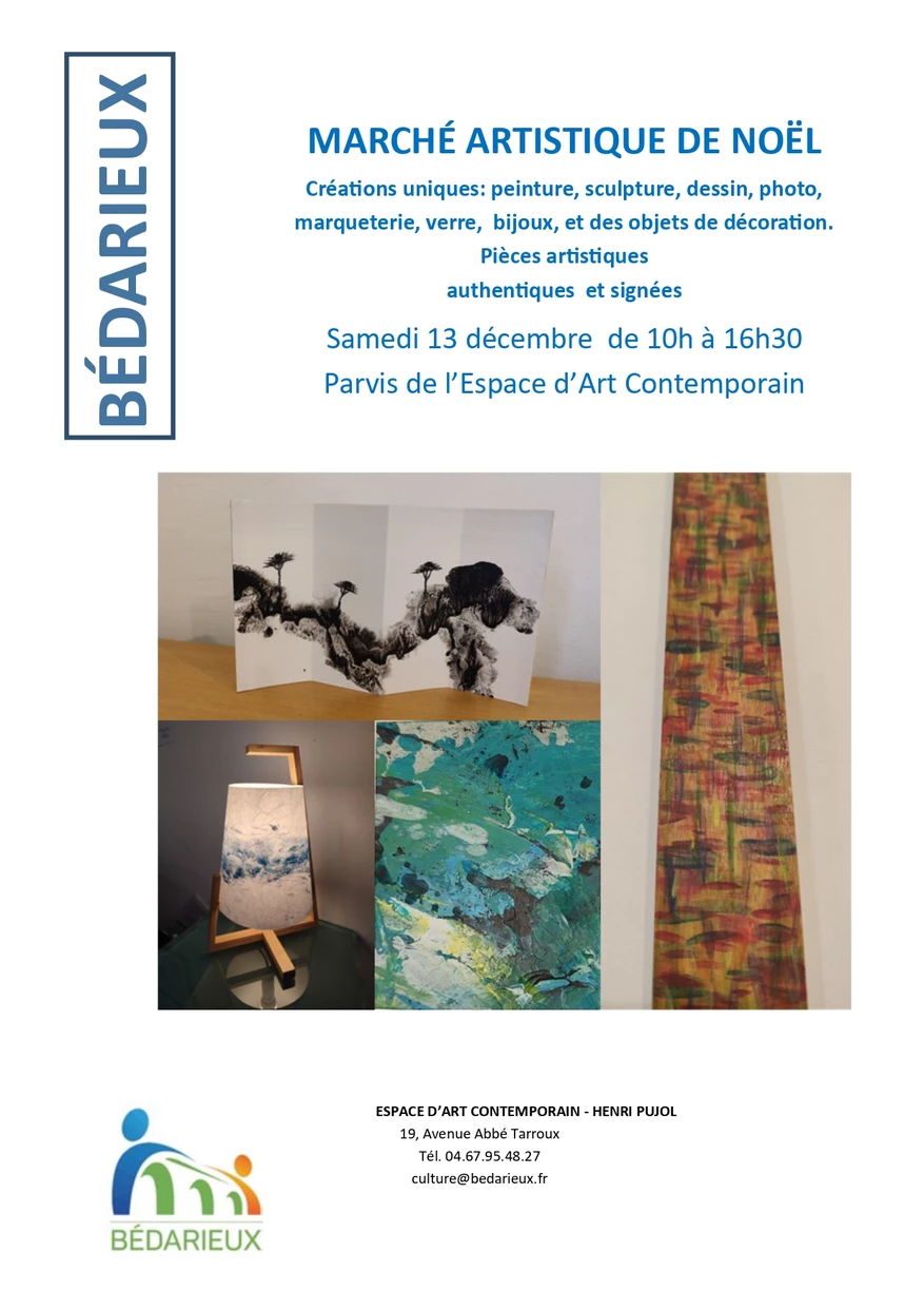 Retrouvez ce samedi 13 décembre à partir de 10h, le marché des artistes. Installé sur le parvis de la Maison des Arts, de nombreuses œuvres, sculptures et objets vous seront proposés ! Admirez le savoir-faire des artistes Bédariciens.