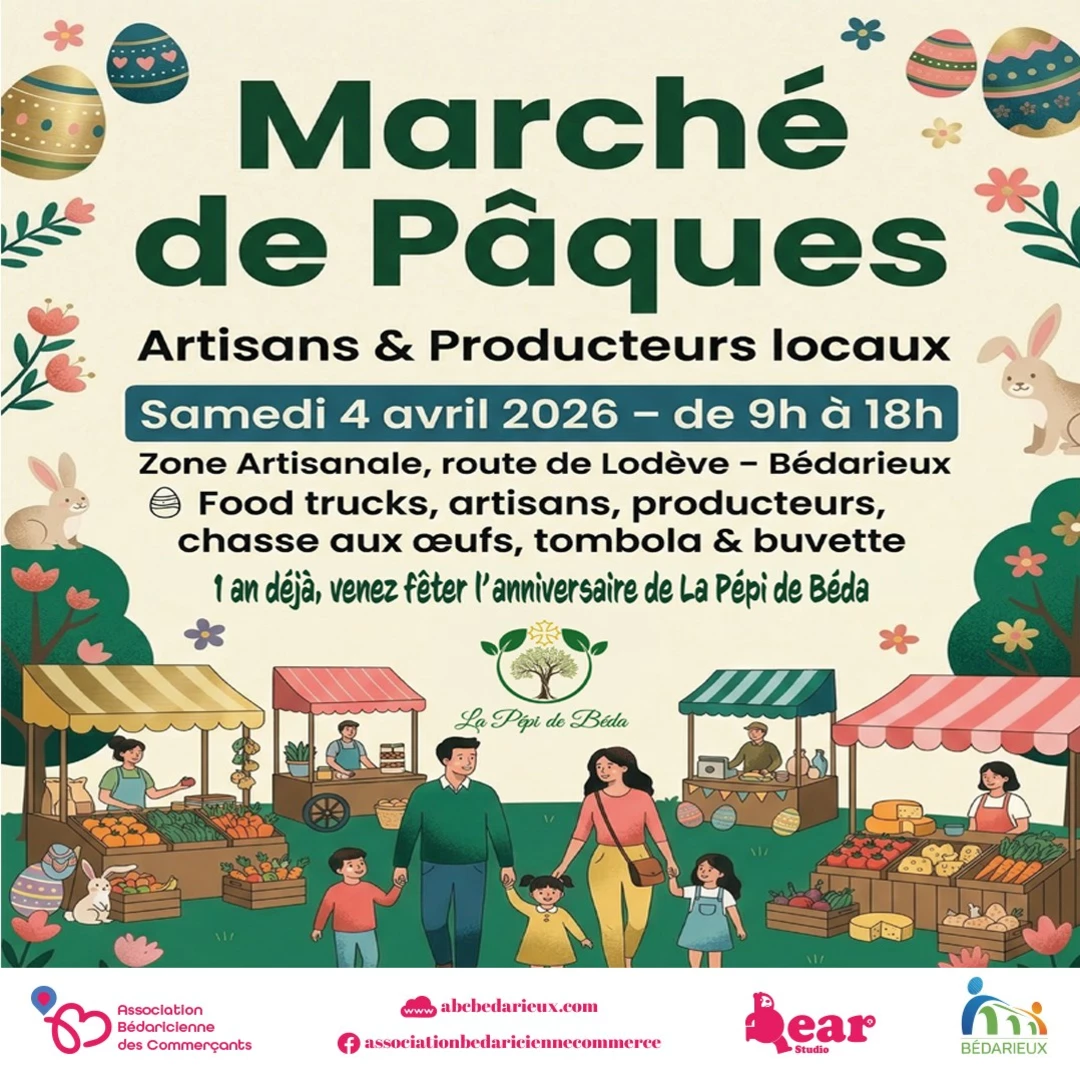 L’Association Bédaricienne des Commerçants, en partenariat avec La Pépi de Béda , vous invite à un grand marché de Pâques des artisans et producteurs locaux pour fêter les 1 an de La Pépi, le samedi 4 avril 2026 de 9h à 18h , dans la zone artisanale, route de Lodève.