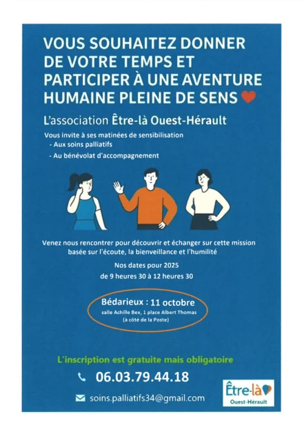 L'association Être-là Ouest-Hérault vous invite à une matinée de sensibilisation le samedi 11 octobre 2025 de 9h30 à 12h30 à la salle Achille Bex. L'occasion de se renseigner et d'échanger sur les soins palliatifs et le bénévolat d'accompagnement.