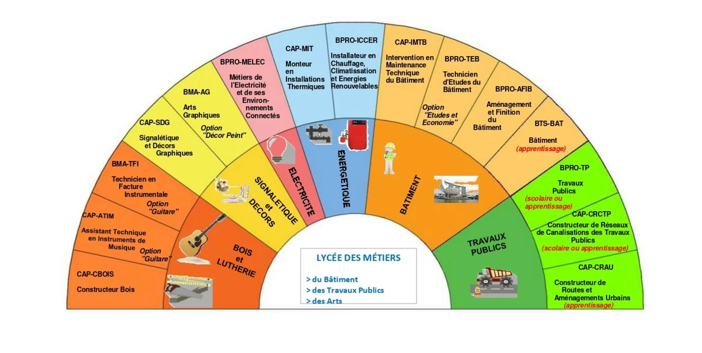 Les formations s'échelonnent du CAP (Certificat d'Aptitude Professionelle) au BTS (Brevet de Technicien Supérieur), par alternance en passant les baccalauréats professionnels (voie scolaire ou apprentissage) et les Brevets des Métiers d'Arts.