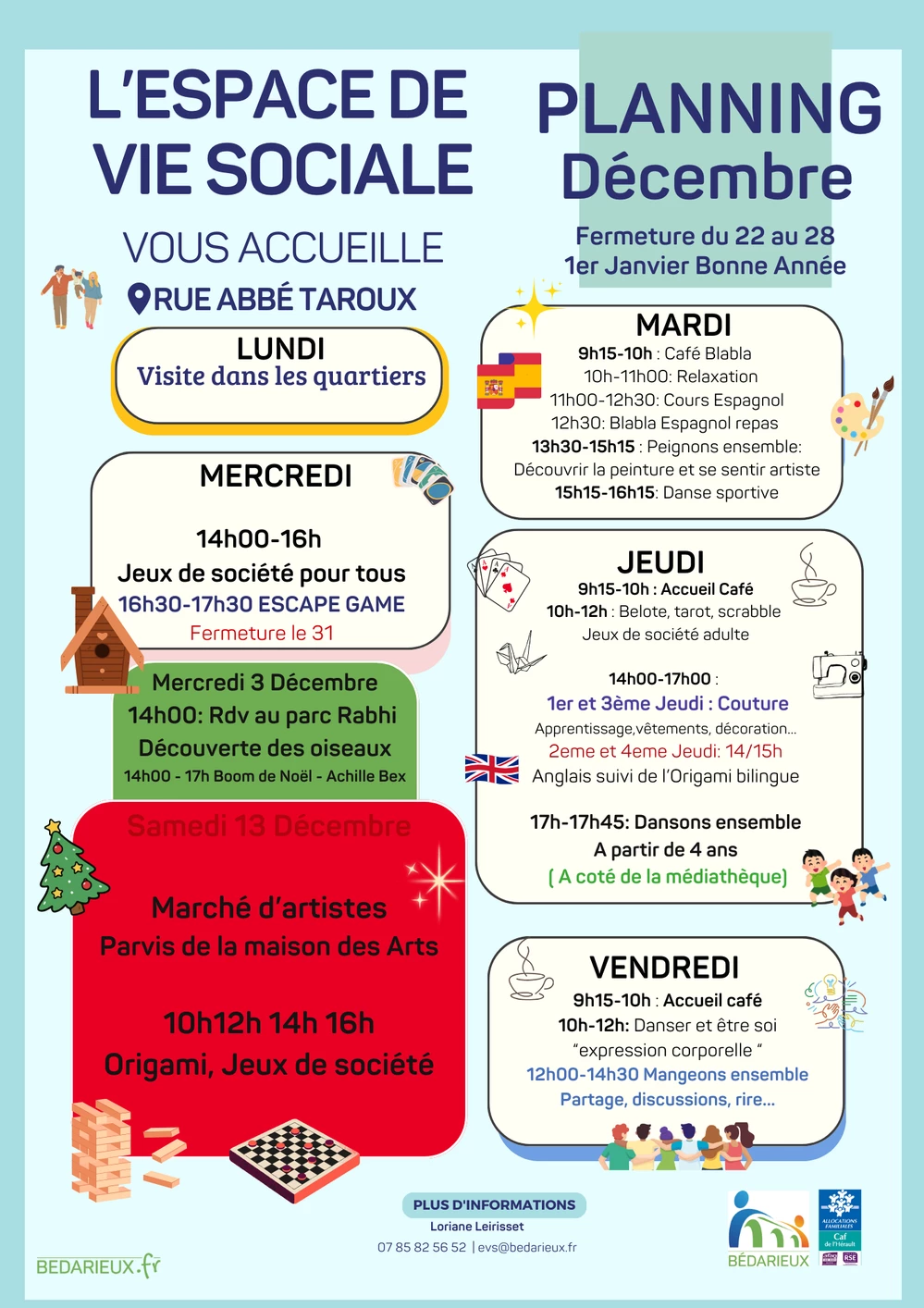 L'espace de vie sociale vous dévoile son nouveau programme pour le mois de décembre. Loriane vous accueille pour de nouvelles activités : danse, relaxation, expression corporelle, peinture, couture, découverte des oiseaux, ou encore escape game, pour les enfants et les adultes !