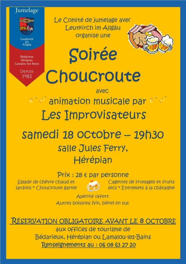 Le Comité de jumelage avec Leutkirch im Allg äu organise une soirée choucroute le samedi 18 octobre 2025 à 18h30 à la salle Jules Ferry à Hérépian . Une ambiance festive et conviviale garantie avec une animation musicale par Les Improvisateurs.