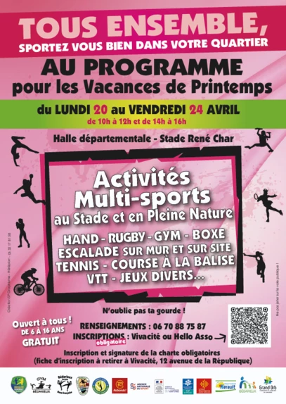 Du 20 au 24 avril 2026 , des activités sportives sont proposées au stade René Char et en pleine nature, de 10h à 12h et de 14h à 16h .
