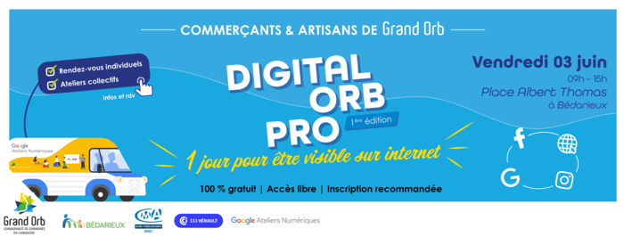 La Communauté de communes Grand Orb, la Chambre de Commerce et d'Industrie de l'Hérault, la Chambre de Métiers et de l'Artisanat de l'hérault organisent, en partenariat avec Google Ateliers Numériques et la ville de Bédarieux, un évènement numérique à destination des commerçants et artisans de Grand Orb.
